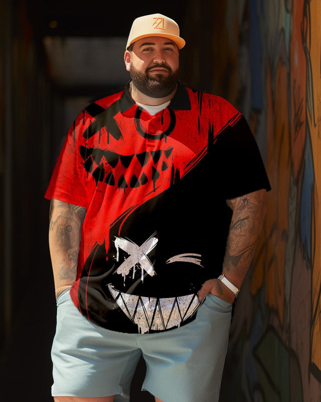 Men's Evil Smile Print Short Sleeve Polo Shirt, Summer Vacation Casual Shirts , Casual Breathable Tops,Gifts for Men