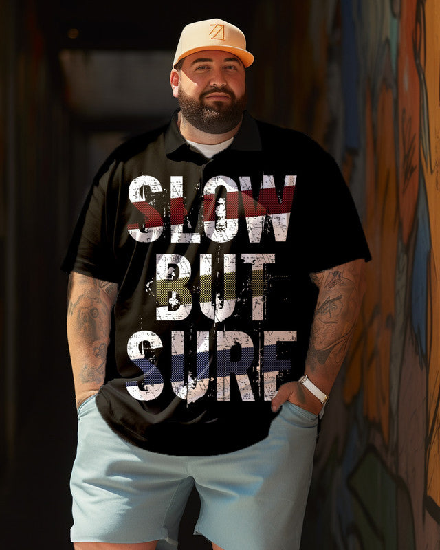 Men's Slow But Sure Printed Short Sleeve Polo Shirt, Summer Vacation Casual Shirts , Casual Breathable Tops, Vintage Clothing