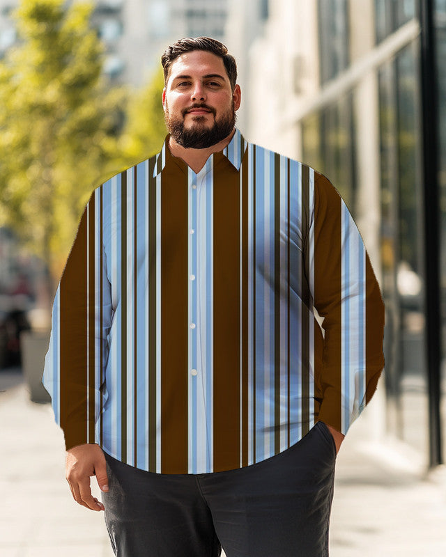Men's Vertical stripes coffee/blue Plus Size Long Sleeve Shirt , Button Down Shirt