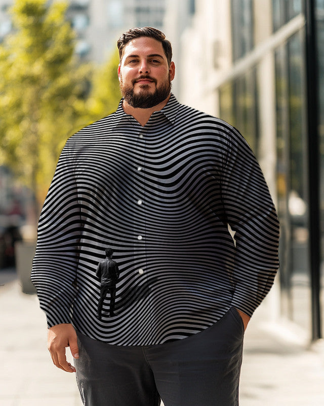 Men's Wavy stripes grey/black Plus Size Long Sleeve Shirt , Button Down Shirt